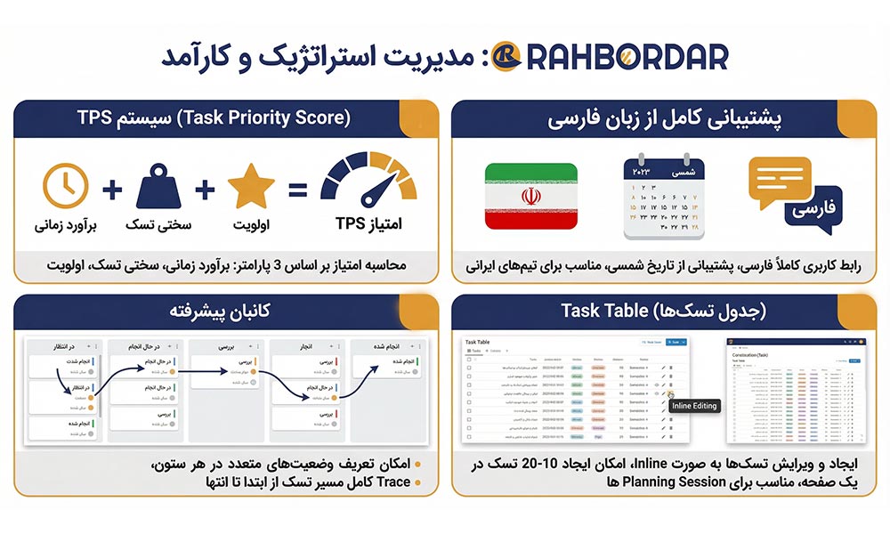 مای راهبرد با ویژگیهای منحصربهفردی مانند سیستم TPS که امتیاز اعضای تیم را بر اساس برآورد زمانی، سختی تسک و اولویت محاسبه میکند، کانبان پیشرفته با قابلیت تعریف وضعیتهای متعدد در هر ستون و Trace کامل مسیر تسک و همچنین Task Table برای ایجاد و ویرایش سریع ۱۰-۲۰ تسک به صورت Inline در جلسات برنامهریزی، ابزاری بسیار قدرتمندتر و کاربردیتر نسبت به ترلو ارائه میدهد.